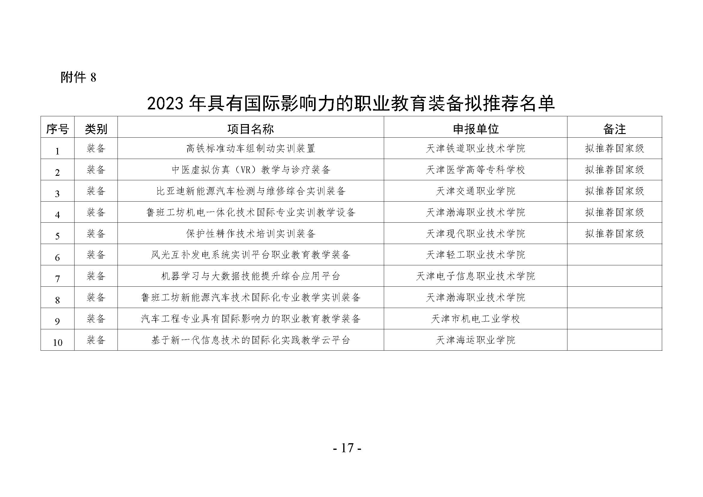 10月17日,天津市教育委員會在其官方發(fā)布《關(guān)于現(xiàn)代職業(yè)教育體系建設(shè)改革相關(guān)重點任務(wù)天津市擬推薦名單的公示》的通知,根據(jù)教育部辦公廳《關(guān)于加快推進(jìn)現(xiàn)代職業(yè)教育體系建設(shè)改革重點任務(wù)的通知》(教職成廳函〔2023〕20號)相關(guān)要求,市教委組織開展了職業(yè)教育一流核心課程、優(yōu)質(zhì)教材、校企合作典型生產(chǎn)實踐、具有較高國際化水平的職業(yè)學(xué)校、具有國際影響力的職業(yè)教育標(biāo)準(zhǔn)、資源、裝備等項目申報工作,經(jīng)學(xué)校申報、專家評審等程序,將現(xiàn)代職業(yè)教育體系建設(shè)改革重點任務(wù)擬入選市級項目及天津市擬推薦名單予以公示。