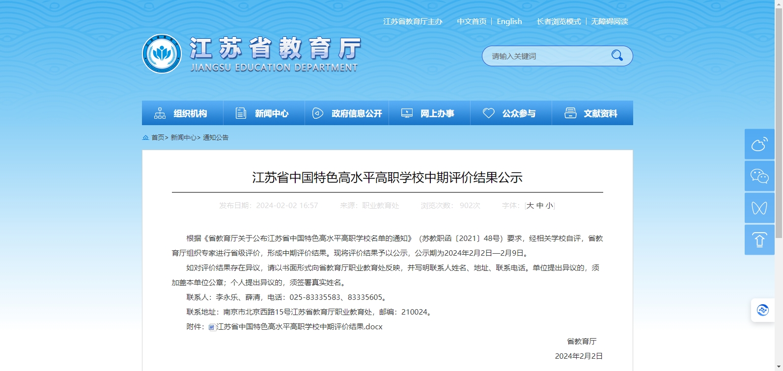 根據《省教育廳關于公布江蘇省中國特色高水平高職學校名單的通知》(蘇教職函〔2021〕48號)要求,經相關學校自評,省教育廳組織專家進行省級評價,形成中期評價結果?,F(xiàn)將評價結果予以公示,公示期為2024年2月2日—2月9日。