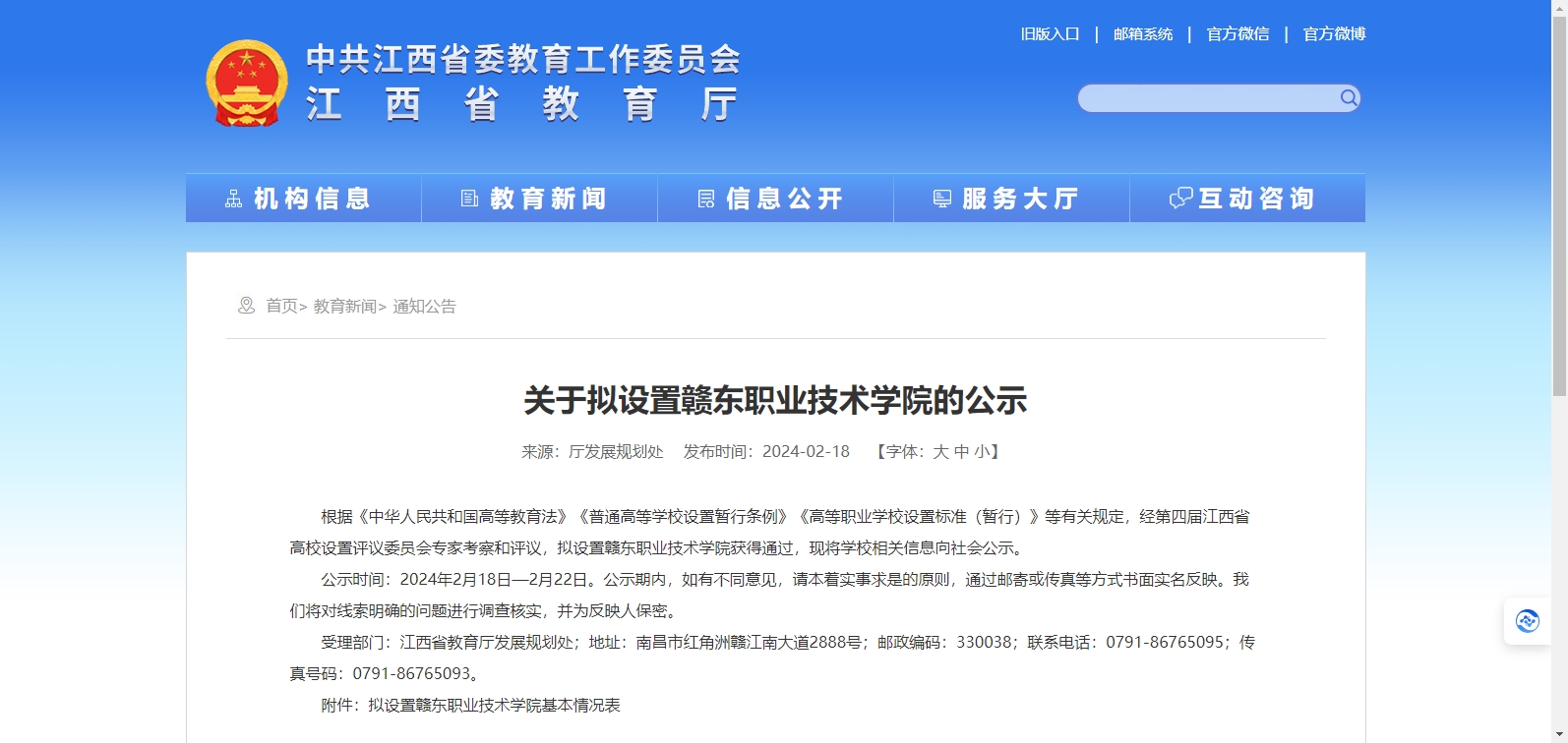 根據(jù)《中華人民共和國(guó)高等教育法》《普通高等學(xué)校設(shè)置暫行條例》《高等職業(yè)學(xué)校設(shè)置標(biāo)準(zhǔn)(暫行)》等有關(guān)規(guī)定,經(jīng)第四屆江西省高校設(shè)置評(píng)議委員會(huì)專家考察和評(píng)議,擬設(shè)置贛東職業(yè)技術(shù)學(xué)院獲得通過(guò),現(xiàn)將學(xué)校相關(guān)信息向社會(huì)公示。