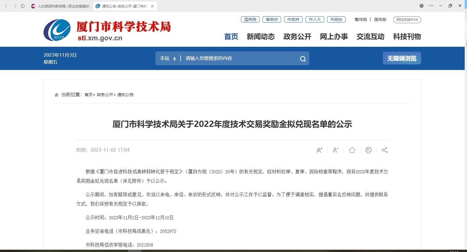 11月2日,廈門市科學(xué)技術(shù)局發(fā)布《關(guān)于2022年度技術(shù)交易獎(jiǎng)勵(lì)金擬兌現(xiàn)名單的公示》通知, 根據(jù)《廈門市促進(jìn)科技成果轉(zhuǎn)移轉(zhuǎn)化若干規(guī)定》(廈府辦規(guī)〔2022〕20號(hào))的有關(guān)規(guī)定,公示鳳凰創(chuàng)壹等371家企業(yè)......
