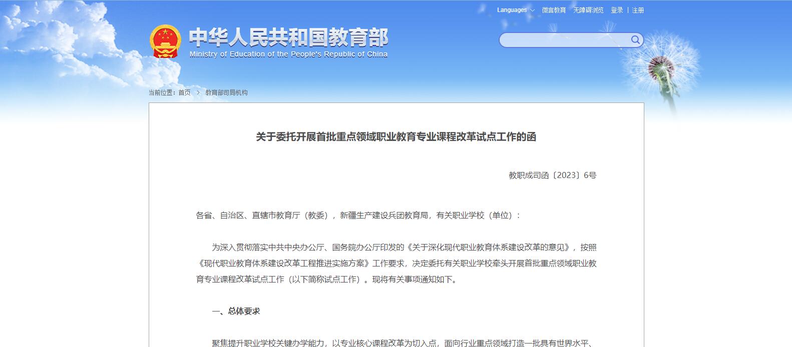教育部職成司發(fā)布關(guān)于委托開(kāi)展首批重點(diǎn)領(lǐng)域職業(yè)教育專業(yè)課程改革試點(diǎn)工作的函