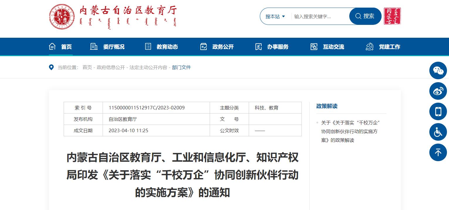 內(nèi)蒙古自治區(qū)教育廳等3部門聯(lián)合印發(fā)《關于落實“千校萬企”協(xié)同創(chuàng)新伙伴行動的實施方案》
