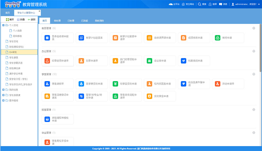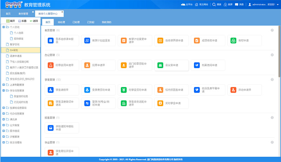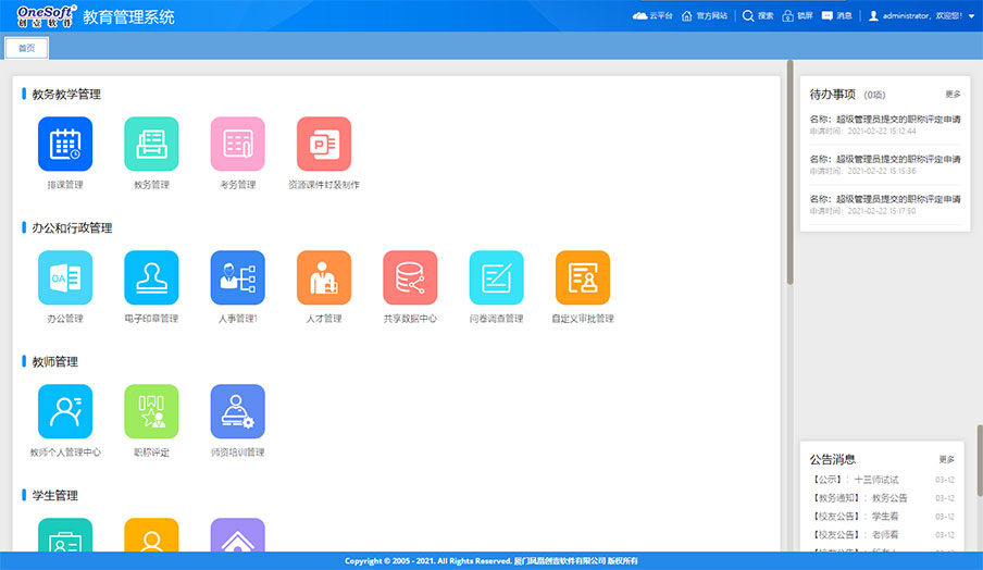 系統(tǒng)由原來的桌面級的管理系統(tǒng)轉(zhuǎn)變?yōu)槊嫦蛴脩籼峁┓?wù)的功能強(qiáng)大的企業(yè)級應(yīng)用平臺。如工作報(bào)告、任務(wù)交辦、項(xiàng)目管理、工作任務(wù)管理、管理看板、學(xué)校知識庫、檔案管理等這些工具支撐日常工作,為教職工工作增效,為干部決策和管理賦能,可提大提升全員工作效率和學(xué)校管理水平。